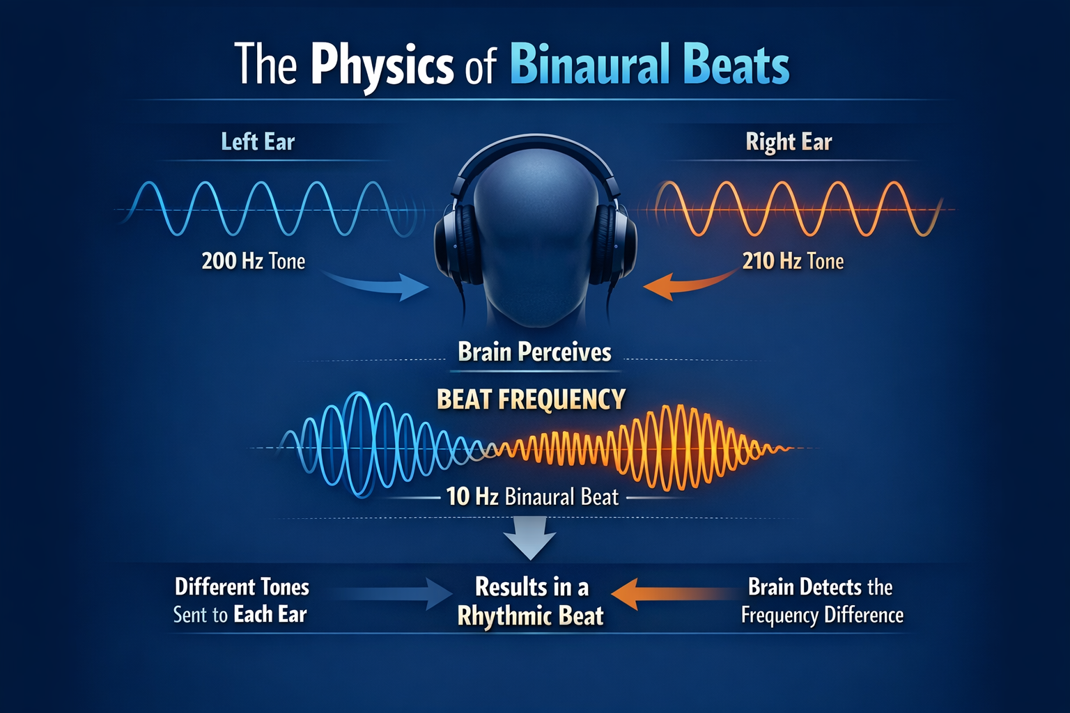 Output: The processed audio is delivered to your headphones with the left and right channels containing slightly different pitches. Your brain synthesizes the binaural beat and entrainment occurs while you listen to the music you enjoy.